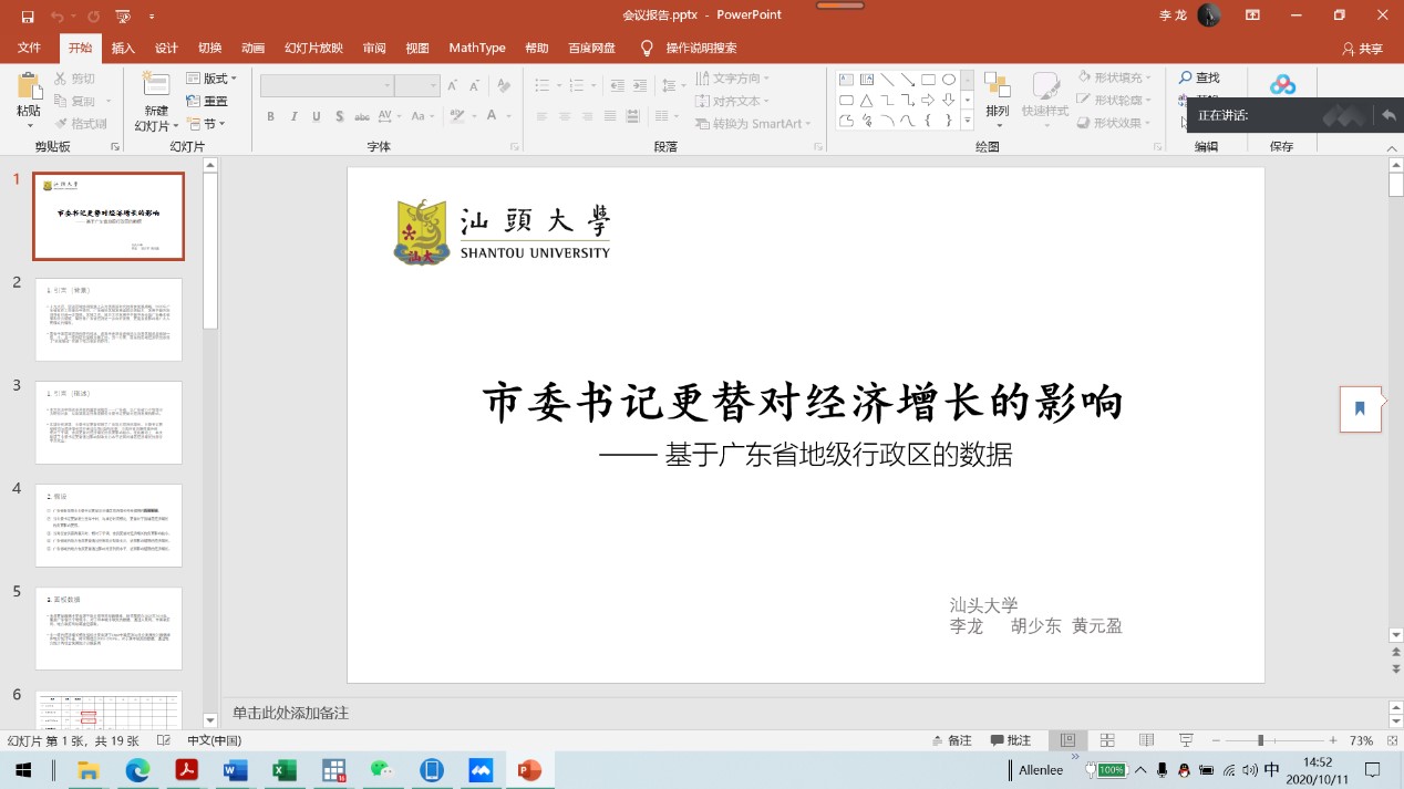 437bwin必赢国际官网必赢国际437官方硕士研究生李龙应邀参会,并于10月11日下午在“高质量经济增长”分论坛上作了主题为“市委书记更替对经济增长的影响——基于广东省地级行政区数据”的报告。论坛评委对投稿论文在研究视角的创新性和研究内容的深刻性等方面给予了充分肯定,认为论文的研究结论具有一定的现实意义,并联系现实政治生态环境对论文后续完善提出了宝贵的建议。