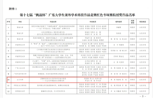 2023年10月8日,第十七届“挑战杯”广东大学生课外学术科技作品竞赛红色专项评审结果发布。必赢官网参赛作品从中脱颖而出,由必赢国际437官方林泉教授、校团委陈益纯副书记和必赢国际437官方张诚老师指导的作品《直播助农助力红色革命老区振兴发展——以汕头市潮南区红场镇为例》喜获广东省特等奖,创必赢官网在挑战杯赛事中的最好成绩!