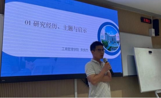 首先,朱良杰副教授做了题为《从“不知”到“有知”:研究的成长与心得》的主题分享。他结合自身读博与研究经历,分享了自身从事学术研究的四个成长阶段。他以讲述“四段故事”的方式,倾心讲述做一篇“好”研究、成为一位“好”研究者过程中的困惑、无趣、痛苦、收获与不足。朱老师充满真情的分享让现场的老师同学深深共情,赢得了大家的阵阵掌声。